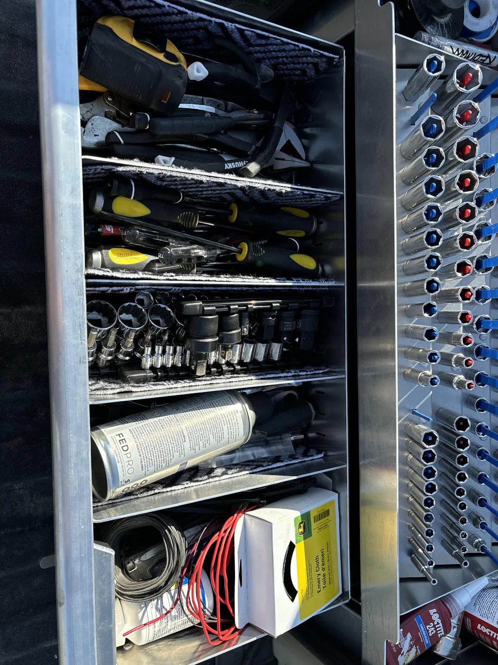 - Dedicated slots for wrenches, sockets, screwdrivers